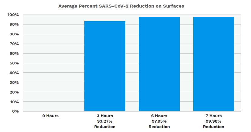 Testing done at MRIGlobal, an independent, FDA-Compliant laboratory. % Reductions measured incrementally over natural degradation of SARS-CoV-2. Outside of control group - over 99.9% reduction of SARS-CoV-2.